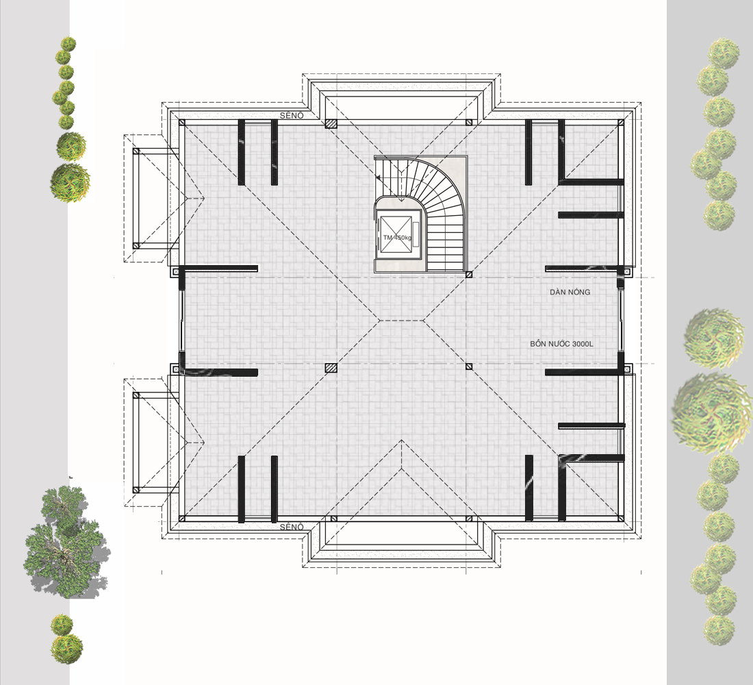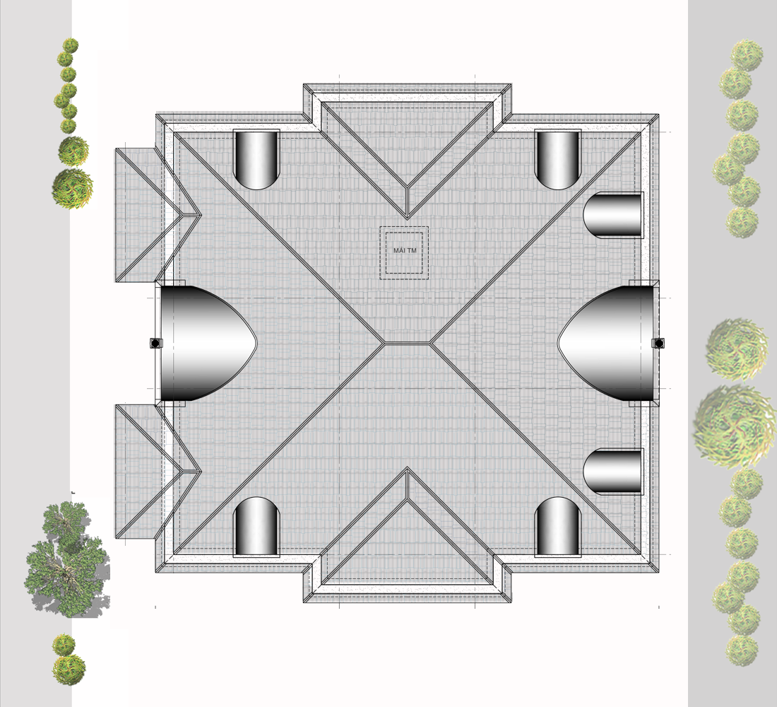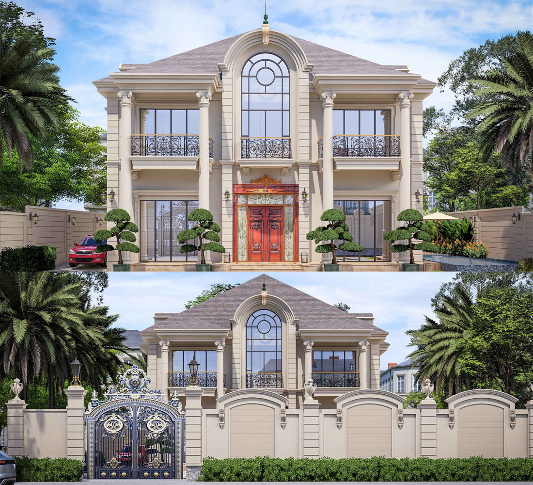 Công trình được xây dựng trên diện tích rộng rãi, với các đường nét kiến trúc tinh tế và cân đối. Các chi tiết trang trí như cột trụ, phào chỉ, mái vòm và hoa văn được thiết kế tỉ mỉ, mang đến sự hài hòa giữa sự trang trọng của phong cách cổ điển và sự thanh thoát, nhẹ nhàng của kiến trúc hiện đại. Mặt tiền biệt thự ấn tượng với các cửa sổ kính lớn, ban công rộng rãi và các chi tiết trang trí tinh xảo, tạo điểm nhấn thu hút ánh nhìn.