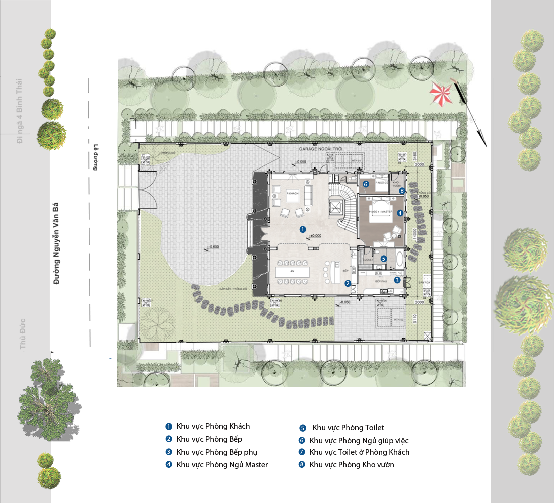 Sân vườn xung quanh biệt thự được chăm chút với cây xanh, tiểu cảnh và hồ nước, tạo nên một không gian sống gần gũi với thiên nhiên. Các chi tiết ngoại thất như đường dạo, đèn chiếu sáng cổ điển và những chiếc ghế ngoài trời cũng góp phần tạo nên một không gian nghỉ ngơi lý tưởng cho gia đình.